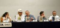 Elisa Ramírez Castañeda, Waldo Leyva, Eduardo Langagne, Francisco Serrano y Efraín Bartolomé durante la presentación, ayer en Bellas Artes, de la primera colección de Editorial Calamus, proyecto impulsado por el pintor Francisco Toledo