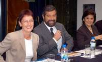 Cornelia Weber, presidenta de UMAC; el rector Juan Ramón de la Fuente, y Sari Bermúdez, directora del Consejo Nacional para la Cultura y las Artes, durante la inauguración del sexto Congreso Internacional de Museos Universitarios, cuya anfitriona es la UNAM