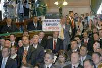 Guanajuato, Gto., 26 de septiembre. Un grupo de perredistas se manifestó contra la presencia de Felipe Calderón Hinojosa en la toma de protesta de Juan Manuel Oliva Ramírez como gobernador constitucional de Guanajuato. Afuera del Congreso local, luego de levantarse el cerco de seguridad, panistas y policías estatales, así como miembros del Estado Mayor Presidencial (EMP), agredieron a los militantes del sol azteca.