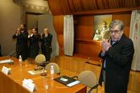 Juan Ramón de la Fuente, rector de la UNAM; Paulina Lavista, viuda de Salvador Elizondo, Ramón Xirau y, en primer plano, José Emilio Pacheco, la noche del jueves, durante el homenaje que recibió el autor de Farabeuf, en El Colegio Nacional