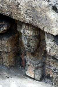 Friso empotrado en la base del altar descubierto en Las Ajaracas, cuya figura representa, a reserva de investigaciones posteriores, a una deidad mexica relacionada con la agricultura