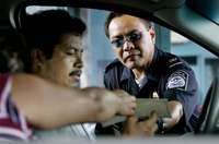 Ampliar la imagen Un agente de la Patrulla Fronteriza de Estados Unidos revisa la documentaci�n de un automovilista mexicano en el cruce de la Mesa de Otay, California FOTO AP Photo/ Sandy Huffaker