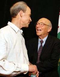 Roger Kornberg, izquierda, es felicitado por su padre, Arthur, quien recibió el Nobel de Medicina en 1959