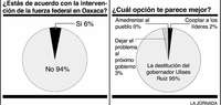 Hay dos puntos en que la opinión pública -con excepción de un sector de la clase política-financiera- parece coincidir en relación con Oaxaca: 1) un rotundo ''no'' a la intervención de las fuerzas armadas y b) un claro ''sí'' a la desaparición de poderes en el estado, que conlleva la destitución del gobernador Ulises Ruiz. En un sondeo en el que participaron 2 mil 882 personas, 94 por ciento contestó negativamente a la pregunta: ''¿Estás de acuerdo en la intervención de la fuerza federal en Oaxaca?''; 95 por ciento dijo que la mejor opción es la salida del gobernador.