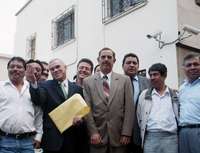 El ex candidato priísta a la gubernatura de Chiapas, José Antonio Aguilar Bodegas, saluda momentos antes de entregar una carta dirigida al presidente electo Felipe Calderón en su casa de transición. Lo acompañan diputados federales y locales