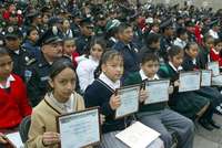 Hijos de polic�as auxiliares muestran los reconocimientos que les entreg� el jefe de Gobierno del DF, Alejandro Encinas, ayer en el patio de Armas del Castillo de Chapultepec FOTO Jos� Carlo Gonz�lez