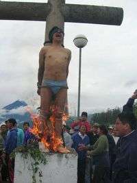 Aldeanos queman las piernas de Mario Quispe después de acusarlo de un robo en Pelileo Grande, unos 110 kilómetros al sur de Quito. Un sacerdote intenta extinguir las llamas que rodean al delincuente, quien posteriormente fue llevado por la policía a un hospital del lugar