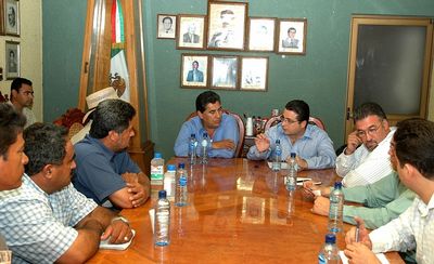 El secretario de Gobierno estatal, Roberto Ruibal Astiazarán (al centro, de anteojos) encabezó las negociaciones con los líderes del Movimiento Unico de Rezonificación de Etchojoa (MURE), que concluyó con la huelga de hambre que mantuvieron diez maestros desde el pasado 29 de septiembre en demanda de la rezonificación salarial