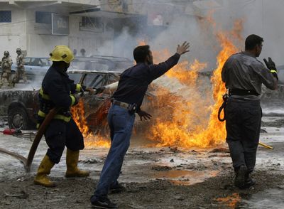 Bomberos intentan apagar el fuego que consume a vehículos, poco después de un atentado con explosivos en un estacionamiento en la zona central de Bagdad