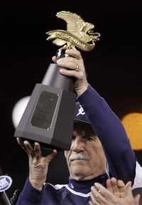 El manager Jim Leyland muestra el trofeo de la Liga Americana