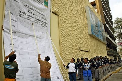 El Movimiento por la Escuela Pública, integrado por profesores y educadoras públicas, así como padres de familia, se instaló durante dos horas frente al número 18 de avenida Chapultepec y, como acto simbólico, en una megaboleta escolar de calificaciones, evaluó el "contenido educativo" y ético de la programación de Televisa, la cual, luego de un análisis popular, reprobó en materia de veracidad, objetividad, pluralidad y contenidos.
