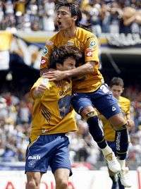 Los argentinos Ignacio Scocco (izquierda) y Ariel González celebran la anotación del primero al conjunto de la UAG