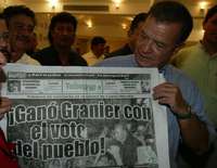 Villahermosa, Tab., 16 de octubre de 2006. El priísta Andrés Granier Melo, virtual ganador de la gubernatura de Tabasco, aseguró que la elección fue ''limpia'' y su triunfo contundente, mientras que la dirigente estatal del Partido Revolucionario Institucional (PRI), Georgina Trujillo, rechazó que el proceso pudiera anularse y hasta presumió, en conferencia de prensa, que ganaron en las casillas instaladas en Tepetitán, la tierra de Andrés Manuel López Obrador.