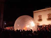 Zacatecas, Zac., 16 de octubre. La historia y la leyenda de Praga, bajo el reinado de Rodolfo II, se escenificó dos veces este domingo en la Plaza de Armas y la calle Hidalgo, la principal de la ciudad, por medio de la obra Adivino de nubes, del grupo italiano Studio Festi, el cual -con gran simbolismo y alarde de recursos técnicos, con un enorme globo rojo del que colgaba una mujer-ángel que esparcía polvo de oro sobre la muchedumbre y una bailarina que volaba dentro de una esfera- capturó la atención de miles de asistentes, entre ellos muchos niños que corrían tras esos objetos que brillaban en medio de la noche. La luz artificial fue apagada.