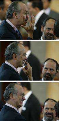 El secretario Francisco Gil D�az; el senador Gustavo Madero, y Teresa Barger, directora de gobierno corporativo del Banco Mundial, ayer, antes de comenzar el foro de negocios en Los Pinos FOTO Jos� Antonio L�pez