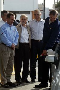 El presidente Vicente Fox llena un tanque con la nueva gasolina Premium UBA. Atestiguan el titular de Semarnat, José Luis Luege; el premio Nobel de Química 1995, Mario Molina, y el secretario de Economía, Fernando Canales Clariond