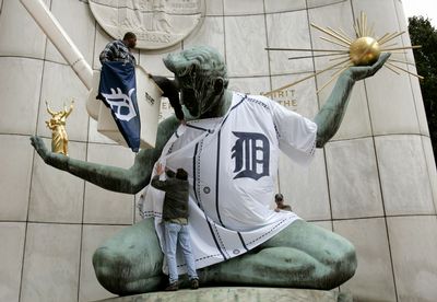 Trabajadores se abocan a colocar una playera a la estatua el Espíritu de Detroit, previo al inicio de la serie contra San Luis, este sábado