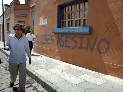 Además, en los meses recientes el edificio del Instituto de Artes Gráficas de Oaxaca (IAGO) ha sido objeto de pintas ofensivas contra Toledo, en las que se cuestiona su obra pictórica.