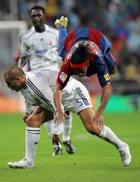 La presión blanca hacía mella en los azulgranas, en los que destacaban Deco y Messi a la hora de hilvanar juego, frente a un Ronaldinho desaparecido del partido.