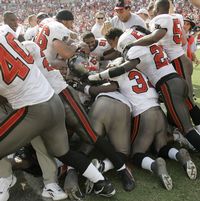 El pateador de Tampa Bay, Matt Bryan, es felicitado por sus compañeros luego de anotar un gol de campo de 62 yardas, en la victoria de su equipo sobre Las Aguilas de Filadelfia, por 23-2