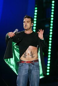 El ex integrante de la banda Take That (una suerte de versión inglesa del grupo estadunidense Backstreet Boys) apareció a las nueve y media de la noche, en medio de un espectáculo de llamas que emergían del suelo.