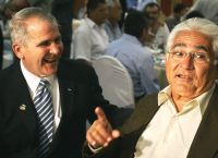 Oliver North (a la izquierda), coronel retirado estadunidense que protagonizó el escándalo Irán-contras en los 80, visitó ayer Nicaragua, donde habló sobre las próximas elecciones. Lo acompaña Edén Pastora, ex jefe de la guerrilla sandinista que luego se pasó a la contra, y hoy es candidato a la presidencia por el partido Alianza por el Cambio