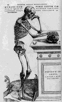 Detalle de Esqueleto pensativo, famosa ilustración en la sección de osteología de De humani corporis fabrica, en la muerte parece meditar sobre la muerte, extraida del libro La fábrica del cuerpo, de Francisco González Crussí