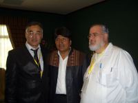 El presidente boliviano, Evo Morales, y el ombudsman mexicano, José Luis Soberanes Fernández, durante la inauguración de la octava Conferencia Internacional de Instituciones Nacionales de Derechos Humanos, en Santa Cruz, Bolivia, donde el titular de la CNDH exhortó a sus homólogos del mundo a pugnar en sus países por la despenalización de la migración y de los migrantes, con el propósito de que la internación indocumentada a un país sea considerada falta administrativa y como tal sea atendida y sancionada. A la izquierda, el ombudsman de Tyrgyzstán, Tursunbay Bakir