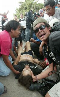 Oswaldo Ramírez tomaba fotografías parapetado detrás de una camioneta, cuando recibió el rozón de una bala. El camarógrafo neoyorquino Bradley Will, de la agencia independiente Indymedia, estaba en medio de la calle con su cámara para registrar los disparos, cuando recibió dos impactos, uno en el costado y otro en la boca del estómago.