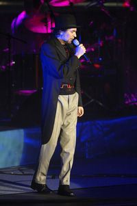 CON UN VIEJO trasatlántico surcando la ancha mar del telón de fondo, vestido de dandy, con sombrero y con bombín, al frente de un sencillo ensamble roquero de guitarras eléctricas, bajo, batería y sintetizador, y lo más importante, con la voz pasmosamente restaurada, como en sus mejores tiempos, Joaquín fue hilvanando, como cuentas de collar, un total de 25 canciones, desde los éxitos a los que ahora el tiempo ha pegado la etiqueta de "siempre", hasta los de Alivio de luto, el disco más reciente que celebra la resurrección de las ganas de beber y joder tras el infarto cerebral de hace algunos años y la depresión posterior.