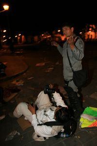 Un elemento de la Policía Federal Preventiva hace una pausa durante la agresión al fotógrafo de La Jornada, Ezequiel Leyva, quien cubría la entrada policial al zócalo oaxaqueño