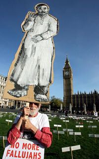 Un pacifista pide el fin de la guerra en Irak en la Plaza del Parlamento británico al cumplirse ayer el segundo aniversario del ataque de fuerzas de ocupación a la ciudad iraquí de Fallujah. A la derecha, con un cartel del clérigo chiíta Moqtada Sadr y su padre, Mohamed Sadeq, uno de los manifestantes que protestaron por el cerco estadunidense en Ciudad Sadr