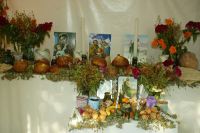 Las personas mayores, sin embargo, contrarrestan estos gustos compartiendo con sus difuntos, a quienes recuerdan mediante fotografías, pan, sal, fruta, manjares culinarios, agua y, si son adultos, vino, para disfrutar juntos el rencuentro.