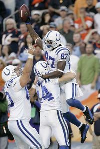Reggie Wayne (87), de Potros, es felicitado por sus compañeros luego del touchdown que el receptor abierto marcó contra Broncos de Denver