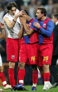 Jugadores del Steaua de Bucarest consuelan a su compañero Banel Nicolita (16), tras el autogol que cometió