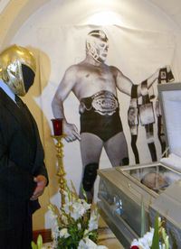 Frente al ataúd, un cartel tamaño natural muestra al amante del pancracio con tres cintos colgando del brazo izquierdo extendido, y uno más se aprecia en la cintura.