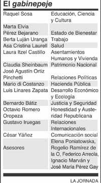 No manejan presupuesto, por lo tanto no pueden darte chamba como asesor. No tienen facultades para asignar contratos de gobierno sin licitación previa ni con concurso, por lo tanto no puedes considerarlos como un buen negocio. Tampoco manejan vales de gasolina, boletos de avión y sus cartas de recomendación difícilmente te procurarán un negocio en el Fobaproa -como a los Bribiesca- o en el SAT -como a los Hildebrando. ¿Entonces para qué diablos sirve el gabinepeje? Como alguien dijo por ahí: la banda -¿se refería al aroma?- está en Los Pinos y en las salas de juntas de las secretarías. Allá se cocinan los grandes negocios y las enormes fortunas. El gabinepeje carece de residencia presidencial, pero quiere hacer una diferencia: una presencia crítica que tenga peso en la conciencia nacional. Aparentemente está blindado o, mejor dicho, imposibilitado a caer en la corrupción de siempre. Veremos.