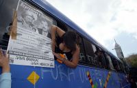 Autobús de la caravana de solidaridad que partió ayer del Hemiciclo a Juárez hacia la ciudad de Oaxaca