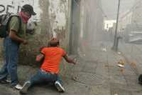 Simpatizantes de la APPO intentan cortar las vallas instaladas por la Policía Federal Preventiva en algunos puntos de la ciudad de Oaxaca