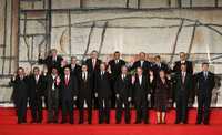 Presidentes, vicepresidentes y cancilleres de los países de Iberoamérica, más el primer ministro español, José Luis Rodríguez Zapatero, y el rey de España, Juan Carlos (al centro), posan para la foto oficial de la 16 cumbre Iberoamericana celebrada el Montevideo el 4 de noviembre