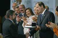 José Guadalupe Reyes Reyes recibe de manos del presidente Fox el Premio Nacional de Ciencias y Artes en la categoría de Artes Populares; a la derecha, Juan Ramón de la Fuente, rector de la UNAM, hace lo propio como galrdonado en el rubro de Ciencias Físico-Matemáticas y Naturales, ayer, durante la ceremonia efectuada en Los Pinos