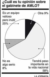 El 58 por ciento de 3 mil 524 personas que contestaron nuestra antiencuesta de esta semana consideran que el gabinete formado por el ''presidente legítimo'' López Obrador tendrá un peso importante en la vida nacional. En cambio, 25 por ciento piensa que es un equipo valioso, pero será inútil para efectos prácticos, ya que actuará desde afuera del gobierno; 8 por ciento estima que eso del gabinete alterno no es algo digno de tomarse con seriedad, y 9 por ciento de los encuestados tienen opiniones distintas a las anteriores.