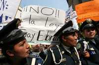 Integrantes de grupos evangélicos que se manifestaron ayer en contra de la aprobación de la ley son contenidos por mujeres policías afuera del recinto legislativo