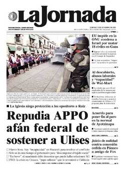 Mujeres tzotziles de la organización civil Las Abejas 45 de cuyos integrantes fueron asesinados por paramilitares el 22 de diciembre de 1997 en Acteal marcharon ayer por la paz en la capital oaxaqueña. En su paso hacia la catedral, punto final de la procesión, tuvieron que negociar con mandos de la Policía Federal Preventiva para que se les permitiera ingresar al primer cuadro. Mientras, en la ciudad de México, una nueva caravana de simpatizantes de la Asamblea Popular de los Pueblos de Oaxaca, compuesta por 17 autobuses y 19 automóviles particulares, partió hacia el estado sureño para romper el "cerco informativo" contra la resistencia y participar en la clausura del congreso constitutivo de la organización FOTO Francisco Olvera