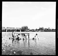 Puente del ferrocarril con lavanderas en el primer plano. Foto: Juan Rulfo |