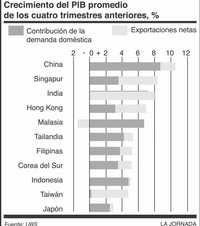 En efecto, el crecimiento de las exportaciones asiáticas podría reducir su marcha, pero es el cambio de las exportaciones netas lo que contribuye al índice de crecimiento de un país, no el tamaño absoluto de ese superávit. Desde 2001, el incremento del superávit comercial de Asia emergente ha contribuido con menos de un punto porcentual anual a la tasa promedio de crecimiento de la región de casi 7%. En contra de la opinión más aceptada, la mayor parte del crecimiento de Asia ha sido impulsada desde adentro. Durante el año pasado, la demanda doméstica (inversión y consumo) creció más despacio que el PIB, excepto en Malasia (ver gráfica 1). Pero en la mayoría de los casos la brecha ha sido pequeña, sobre todo en China, India, Japón e Indonesia. En contraste, el crecimiento en Taiwán, Hong Kong y Singapur ha dependido en gran parte de la demanda externa.