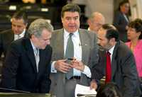 Los senadores panistas Santiago Creel, Felipe González y Gustavo Madero, durante los trabajos de ayer en Xicoténcatl