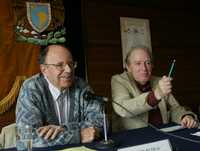 James Petras y John Saxe-Fernández durante su conferencia sobre genocidios, en la Torre II de Humanidades de la UNAM