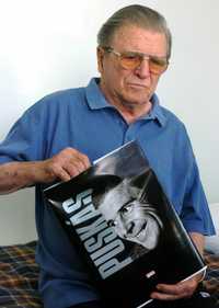 El legendario delantero del Real Madrid muestra un libro sobre su vida titulado Puskas, escrito por su biógrafo Gyorgy Szollosi
