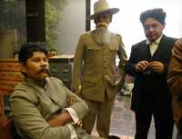 Actores caracterizan a Villa, Carranza y Flores Magón, durante los preparativos para el desfile organizado por el Gobierno del Distrito Federal, con motivo del aniversario 96 del inicio de la Revolución Mexicana
